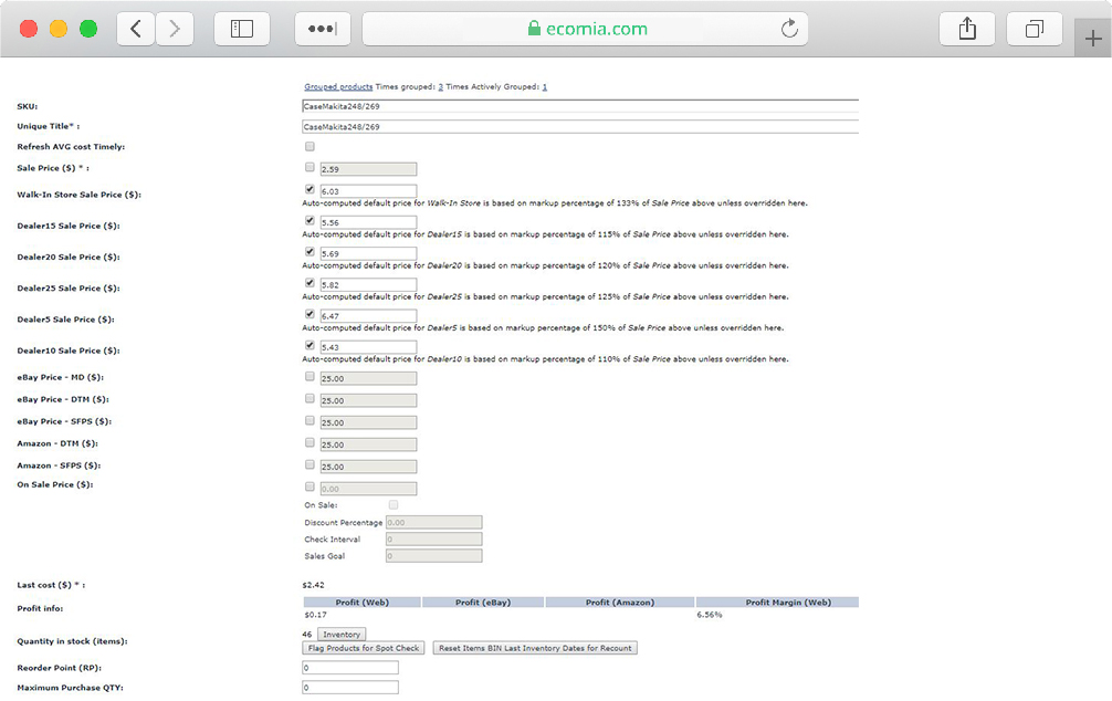 Ecomia supports multiple pricing levels. These tiers include main price, on sale price, discounted price, prices for customer groups, marketplaces pricing and auction/offer pricing. Prices can be automatically set per profit margin based on cost and average cost, or manually set per tier. For multiple upload of pricing, you can use the data import/export tool.